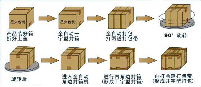 本包裝生產(chǎn)流水線主要操作流程:已裝好產(chǎn)品折好上蓋的產(chǎn)品箱從左邊的滾筒進(jìn)入此流水線,進(jìn)入第1臺包裝機(jī)械:全自動一字型封箱機(jī)(進(jìn)行一字型封箱)—→進(jìn)入第二臺包裝機(jī)械:全自動打包機(jī)(打兩道打包帶)—→進(jìn)入第三臺包裝機(jī)械:90°旋轉(zhuǎn)機(jī)—→進(jìn)入第四臺包裝機(jī)械:全自動角邊封箱機(jī)(進(jìn)入四角邊封箱,形成工字型封箱)—→進(jìn)入較后的第五臺包裝機(jī)械:全自動打包機(jī)(打另外兩道的打包帶,形成井字形打包)—→工字型封箱+井字型打包完成。