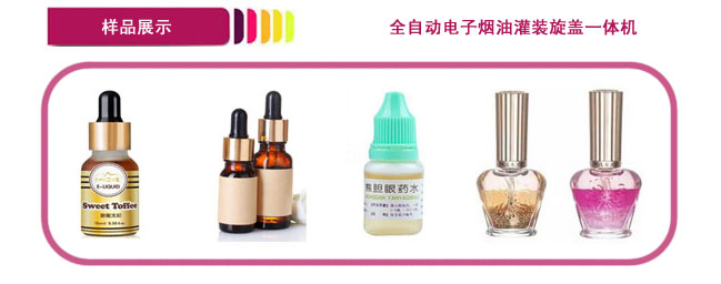 該機(jī)主要適用于50毫升以內(nèi)電子煙油、滴眼液、指甲油、眼影、精油等產(chǎn)品的自動灌裝、加塞和旋蓋。